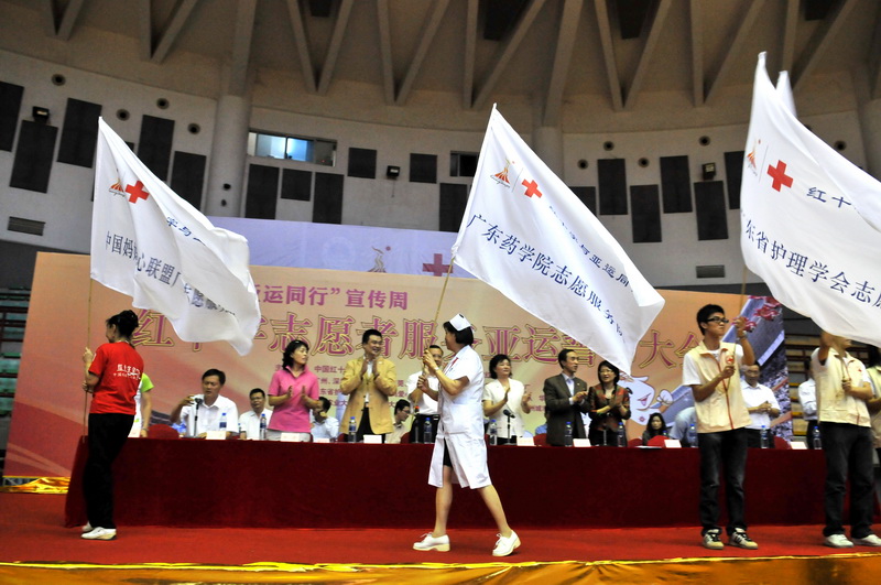 借助于广东省红十字志愿者服务亚运誓师大会的强大东风,于2010年10月23日上午在华南理工大学文体中心隆重召开成立大会。大会由广东省红十字会邵岩副会长主持,参加大会的领导有;中国红十字会总会副会长王海京、第16界亚运会组委会志愿者部部长王涣清、广东省红十学会第六理事会会长雷于蓝等。广东省红十字会理事会会长雷于蓝并向“广东省红十字广东省护理学会志愿服务总队”授志愿服务总队队旗。