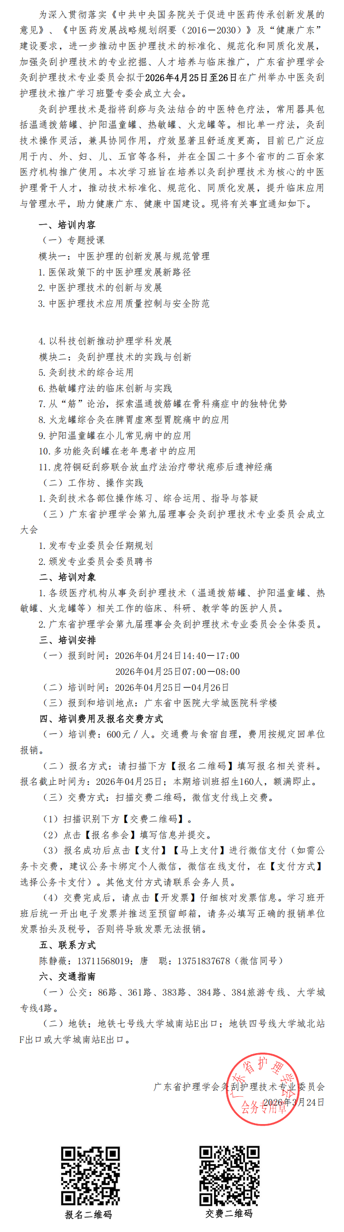 关于举办中医灸刮护理技术推广学习班暨广东省护理学会灸刮护理技术专业委员会成立大会的通知(第一轮)