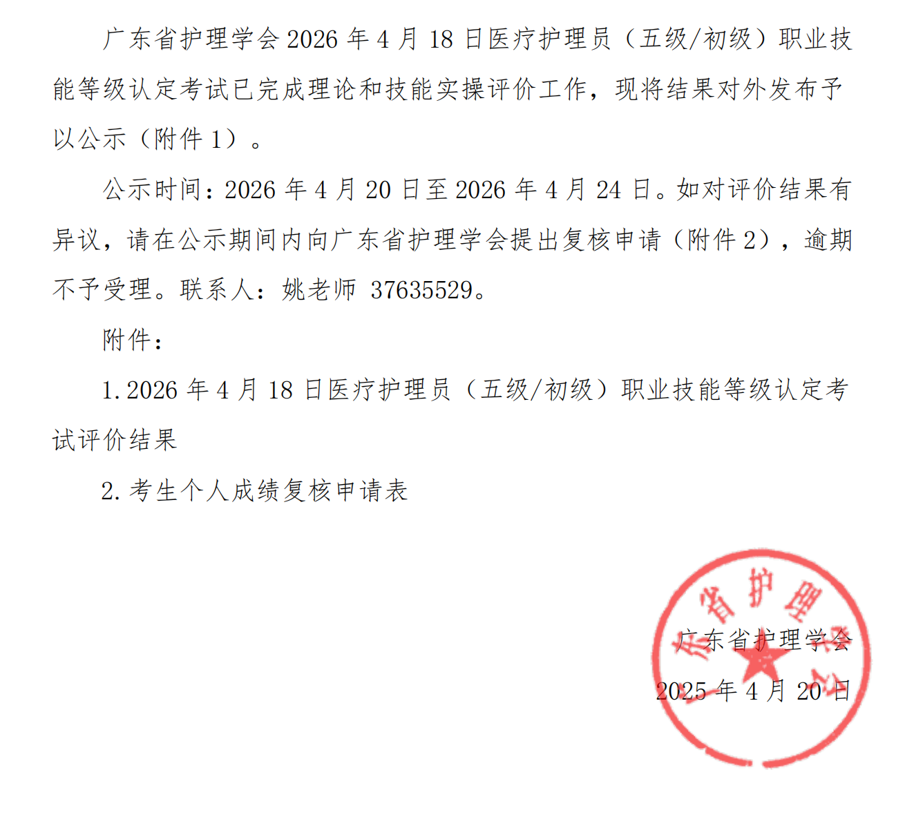 2026年4月20日医疗护理员(五级)职业技能等级认定考试评价结果公示