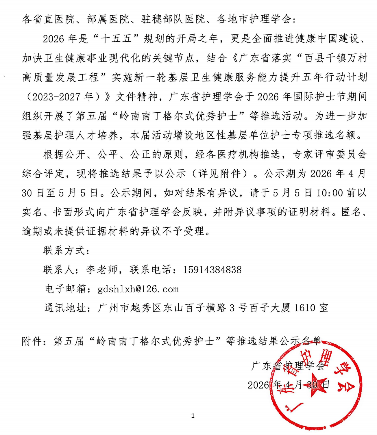 网上公告|| 关于第五届“岭南南丁格尔式优秀护士”等推选结果的公示